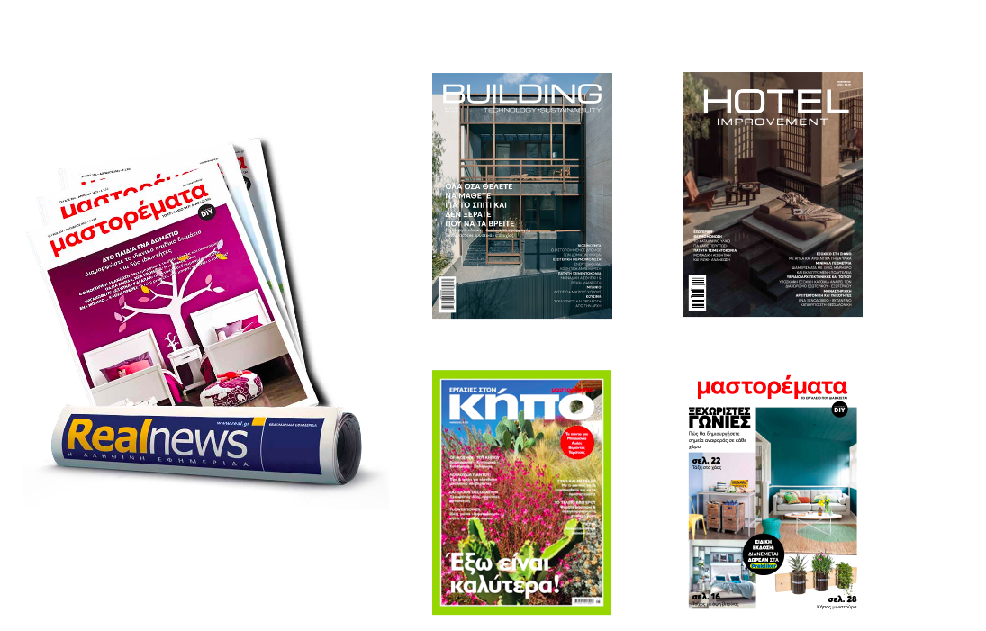 Ετήσια έκδοση, η οποία κυκλοφορεί τον Ιούνιο μαζί με τη Real news και συγκεντρώνει όλες τις καινοτόμες εξελίξεις στον τομέα των δομικών υλικών και του κτιριακού εξοπλισμού, καθώς και των εφαρμογών τους σε νέα έργα και συντηρήσεις. Ένα απαραίτητο «εργαλείο» για όλους τους ιδιοκτήτες κατοικιών, αλλά και τα στελέχη της κατασκευαστικής αγοράς. Κυκλοφορεί και αυτόνομα σε 10.000 σημεία πώλησης πανελλαδικά και αποστέλλεται ηλεκτρονικά και hard copy σε 3.000 επαγγελματίες του κλάδου (κατασκευαστικές εταιρείες, μελετητικά γραφεία, εταιρείες δομικών υλικών και χρωμάτων, επιχειρήσεις παροχής τεχνικών υπηρεσιών, αρχιτέκτονες και interior designers).